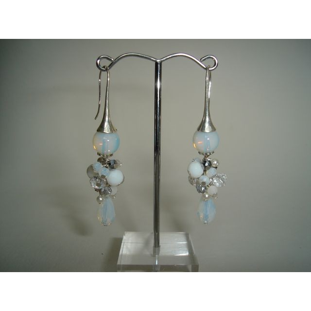 Boucles d'oreilles grappes blanches montées avec du verre et métal argenté sans nickel.