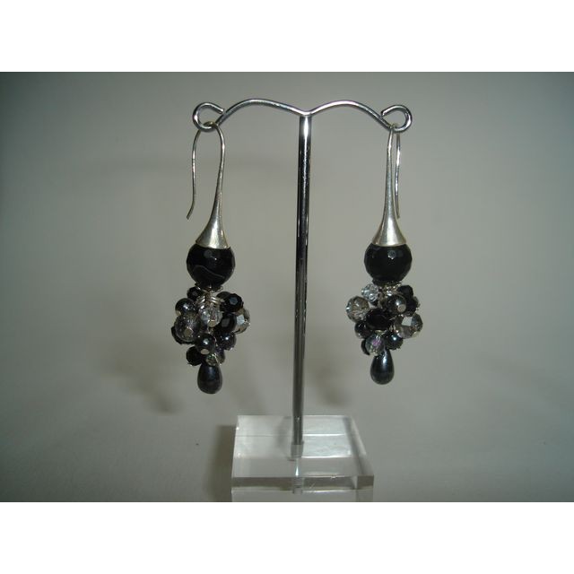 Boucles d'oreilles grappes noires montées avec de l'hématite, cristal, verre et métal argenté sans nickel.