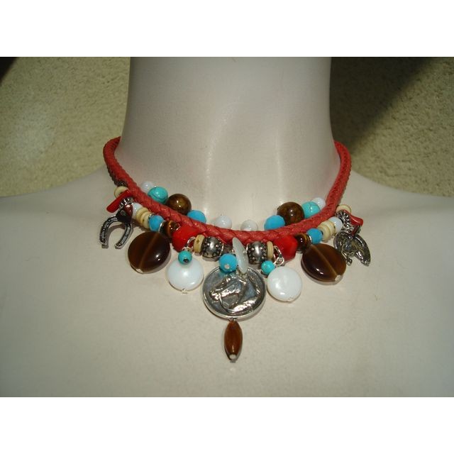 Collier corde monté avec de la nacre, howlite, oeil de tigre, corail bambou, verre et métal argenté sans nickel.