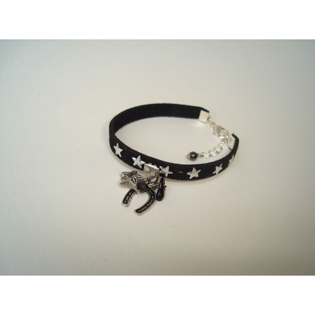Bracelet galon noir avec étoiles argentées monté avec de l'onyx, verre et du métal argenté sans nickel.