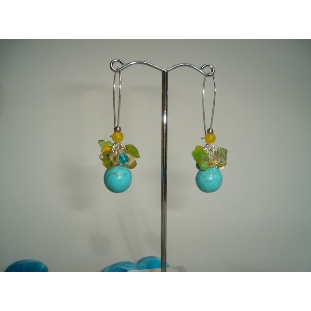 Boucles d'oreilles howlite grappe montées avec de la citrine, verre, céramique et métal argenté sans nickel.