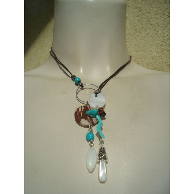 Collier poisson monté avec du jaspe, howlite, nacre, oeil de tigre et métal argenté sans nickel.