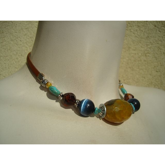 Collier cuir monté avec de la howlite, agate, verre, céramique et métal argenté sans nickel.