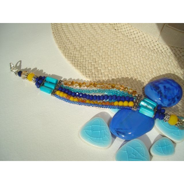 Bracelet 5 rangs monté avec de la nacre, verre, cristal et métal argenté sans nickel.
